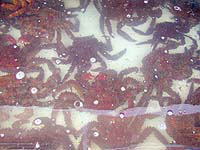 黄色のかごと青色のかご2つにカニを10杯〜12杯くらい入れてロープで縛り、吊り上げて大きな四角いカニ専用の茹で鍋(人ひとりが入れそうな風呂に近い)に入れます。 |