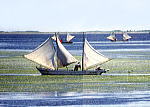 この舟は「打瀬舟」と呼ばれ、スクリュー船だと水深が浅くアマモがからんでしまう為、このような三角帆を立てて風を利用して漁をするのだ。