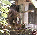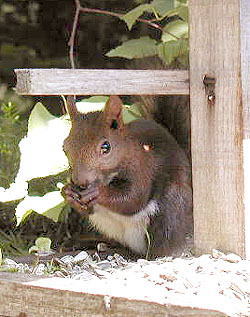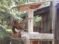 するとナント北海道人でさえもなかなか見ることができないエゾリスが目の前に現れるではないか! 「餌付けされている!」それにしても警戒心が強い野生のエゾリスを目前に見るのは初めてだ! 「カメラ!カメラ!」とあわてているのがこっちの方で、堂々とひまわりの種を頬張っている。 カメラ目線で撮影もできちゃいました。(右上写真) すっかり風呂に入るのも忘れて、可愛さに見とれてしまったほんのひと時でした。 エゾリスの出迎えを受けて露天風呂へ・・・ |