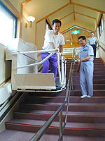 浴場までの通路にある階段には車椅子の方でも昇り降りできるように車椅子用のエスカレーターも完備されているので身障者やその家族にとっては嬉しい限りだ。 |