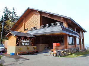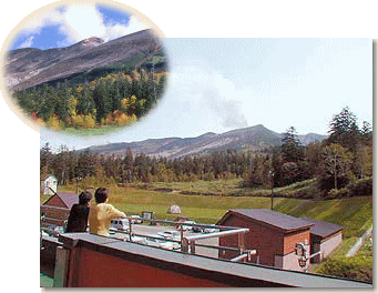 2階展望ラウンジから眺める景色(右写真)からは、平成元年に噴火した十勝岳(標高2,077m)、左隣りに美瑛岳(2,052m)の十勝岳連峰が一望できる。また、登山口も目の前にあり、登山ベースにするには最適な場所だ。 尚、白銀荘さんの詳しいデーターはこちらをクリックして下さい。 |