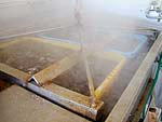 黄色のかごと青色のかご2つにカニを10杯〜12杯くらい入れてロープで縛り、吊り上げて大きな四角いカニ専用の茹で鍋(人ひとりが入れそうな風呂に近い)に入れます。 |
