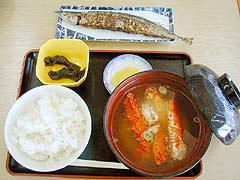 オバちゃん:「じゃあカニ(花咲ガニ)のてっぽう汁」食べてきな!サンマの塩焼定食サービスしとっから!」