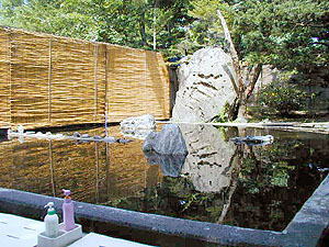 するとナント北海道人でさえもなかなか見ることができないエゾリスが目の前に現れるではないか! 「餌付けされている!」それにしても警戒心が強い野生のエゾリスを目前に見るのは初めてだ! 「カメラ!カメラ!」とあわてているのがこっちの方で、堂々とひまわりの種を頬張っている。 カメラ目線で撮影もできちゃいました。(右上写真) すっかり風呂に入るのも忘れて、可愛さに見とれてしまったほんのひと時でした。 エゾリスの出迎えを受けて露天風呂へ・・・ |