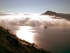 綺麗でしょう!月光の摩周湖、寒暖の温度差で発生する早朝の霧の摩周湖です。