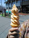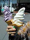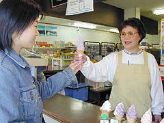 ほんのり酸味の効いたラベンダーソフトと、牛乳ソフト。(左写真)北海道産のミルクをたっぷり使ったまろやかで甘味をおさえた味が売りで〜す。 ![]() 夕張メロンを使った贅沢なメロンソフト。上品な甘さがあって美味しい。(右写真) |